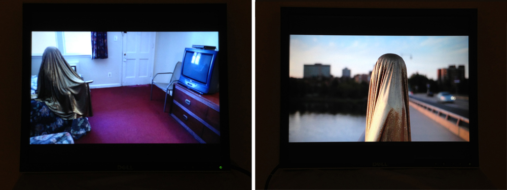 Vega also uses recorded video performances of Thahab inhabiting and interacting with different locations that range from urban to natural and domestic to public. In two of the video pieces, Vega introduces narratives from other Muslim people living in America. In one, imagery of Thahab in a city is overlaid with the recorded narrative of a young man recounting what it was like to grow up Muslim in America. In the other, Thahab inhabits a domestic environment – watches television, prays on the carpet – while the voice of her mother describes how their lives changed in post-9/11 America.